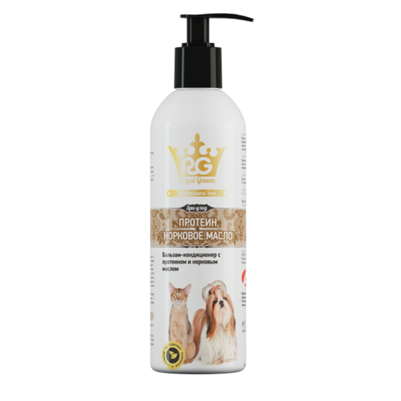 Бальзам-кондиционер Royal Groom с протеином и норковым маслом применяется для регулярного ухода за кожно-волосяным покровом кошек и собак разных пород, с шерстью разных окрасов, котят и щенков, хорьков и декоративных грызунов.