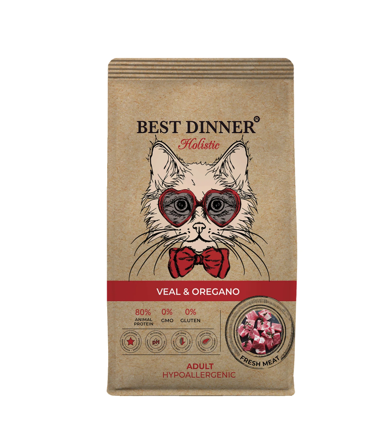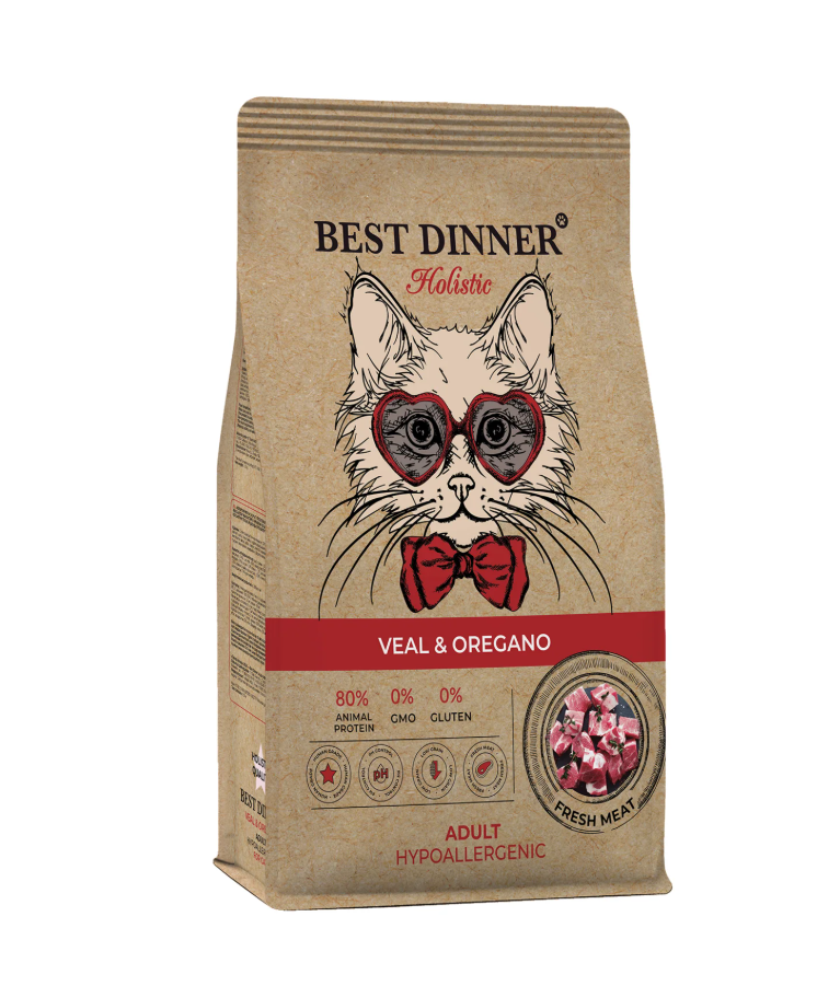 Низкозерновая рецептура для кошек Best Dinner с телятиной и орегано, изготовлена с учетом физиологических потребностей кошек. Свежая телятина с добавлением мяса индейки обогащают рацион необходимыми аминокислотами, а так же делают его потрясающе вкусным и полезным. Орегано, благодаря эфирным маслам, улучшает работу желудочно-кишечного тракта, препятствует вздутию живота. Корень цикория способствует размножению полезной кишечной микрофлоры. Гранулы в форме сердечек не оставят равнодушными даже самых привередливых кошек.