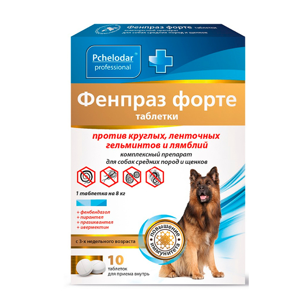 Фенпраз форте таблетки для собак пород содержит в 1 таблетке (на 8 кг веса) в качестве действующих веществ: фенбендазол – 120 мг, пирантела памоат – 112 мг, празиквантел – 40 мг, ивермектина – 0,048 мг.