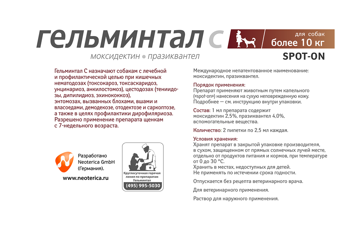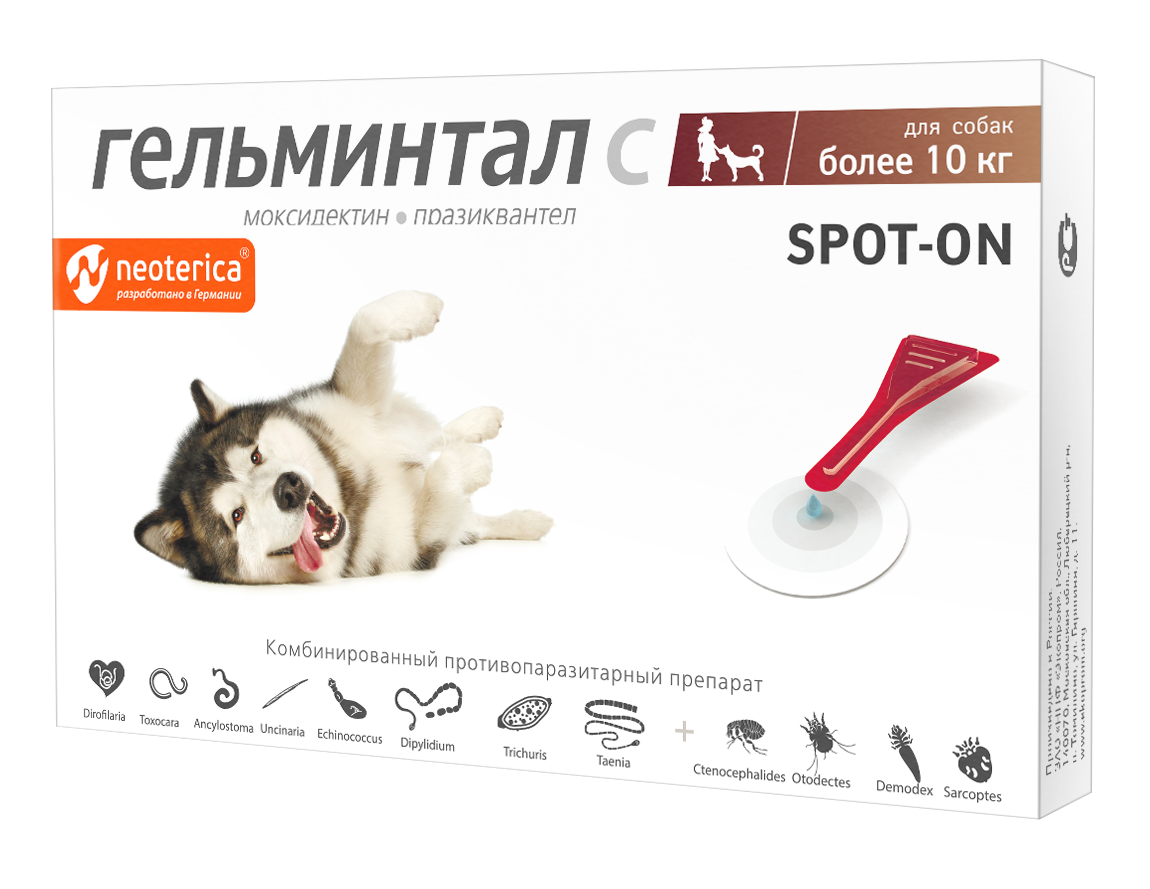 Гельминтал Spot-on для собак - препарат широкого спектра действия. Давайте препарат однократно, как с профилактической, так и с лечебной целью. Капли действуют 1 месяц.