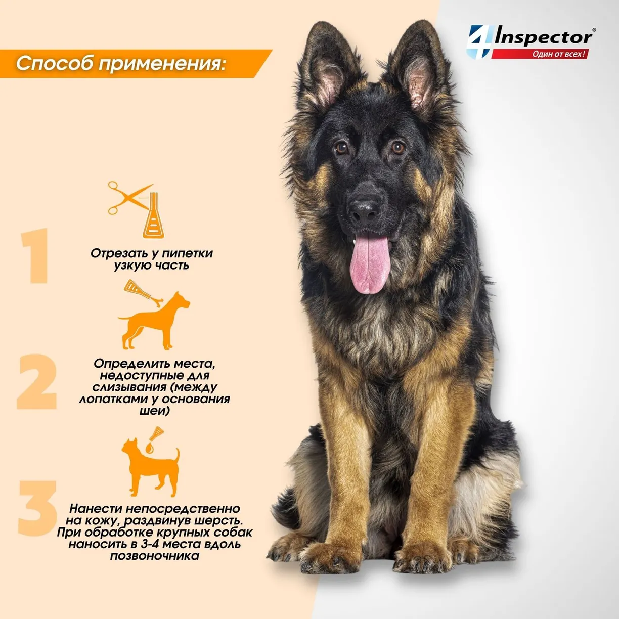 Нанесите Inspector на кожу в области холки (между лопатками), максимально раздвигая шерсть. Не растирайте препарат пальцами. Не рекомендовано мыть животное 2 дня до и 4 дня после обработки.