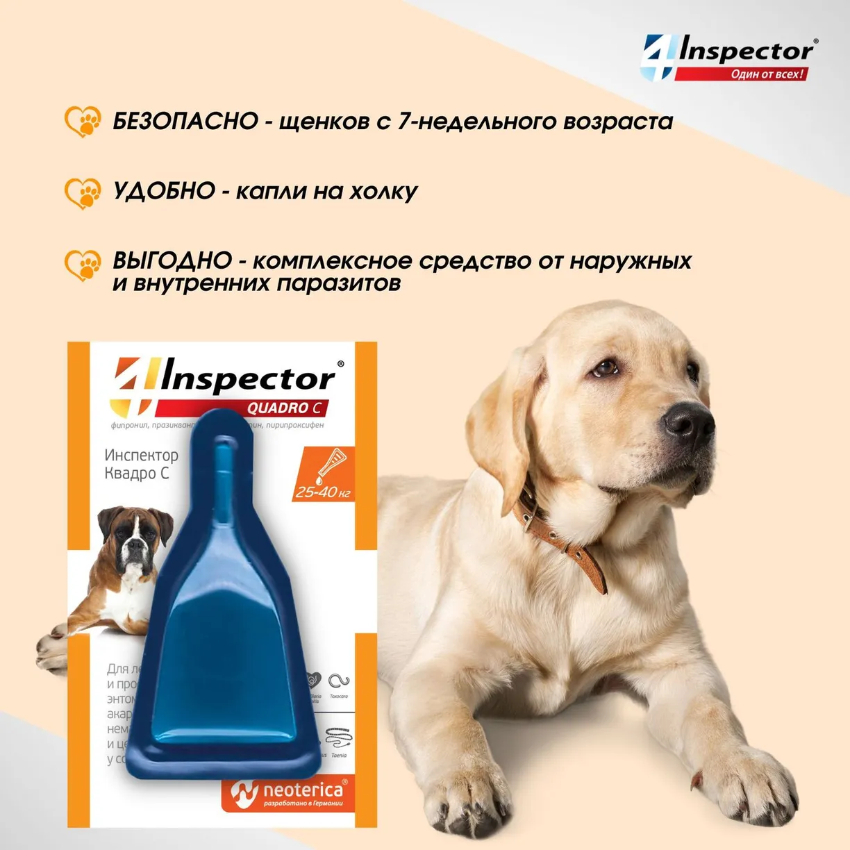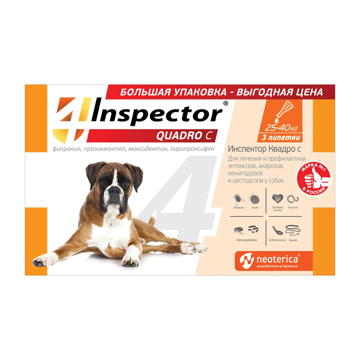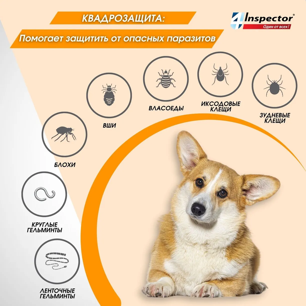 Inspector защищает от 20 видов внешних и внутренних паразитов. Inspector — это инсектоакарицид и антигельминтик.