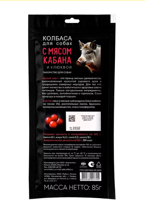Состав: мясо и мясные субпродукты (мясо кабана не менее 4%), растительные масла, клюква, минеральные вещества, смесь токоферолов (натуральный консервант).