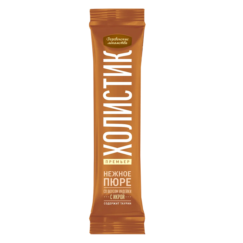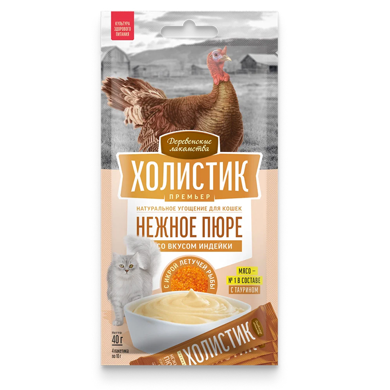 Попробуйте наши новые изысканные десерты «Холистик Премьер». Нежнейшее пюре c отборным мясом индейки, с добавлением настоящего деликатеса — икры летучей рыбы, порадует вашу кошку ярким, насыщенным вкусом. Удобная упаковка позволит вам проводить вместе незабываемые минуты, кормя вашего любимца прямо из пакетика.