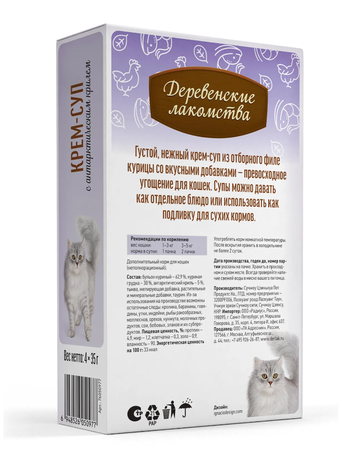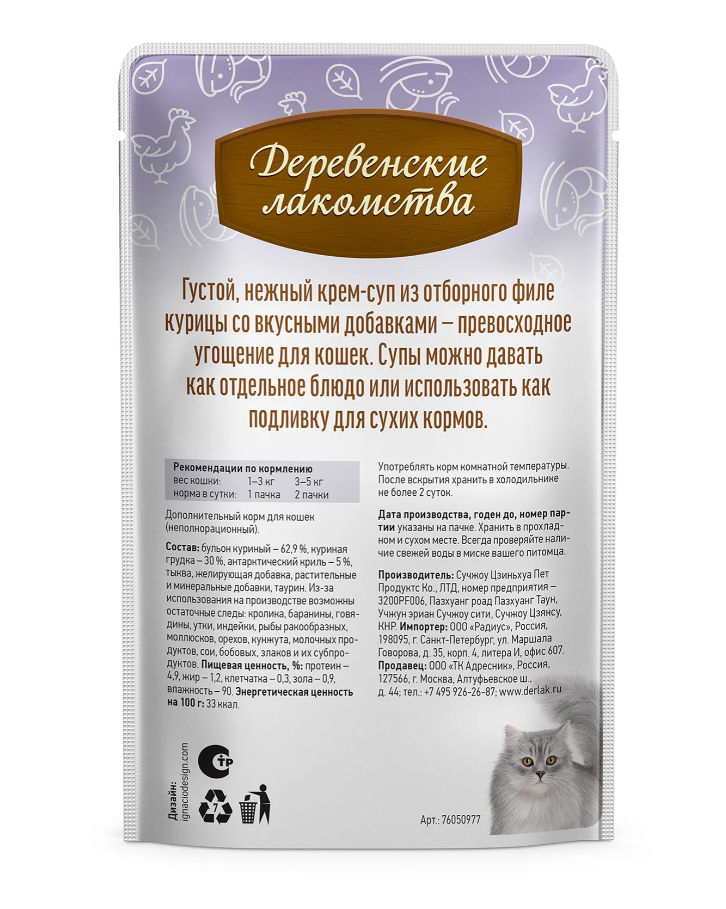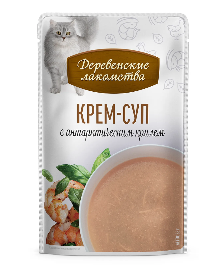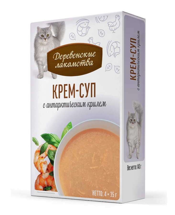 Густой нежный крем-суп из отборной курицы с антарктическим крилем — превосходное угощение для кошек.