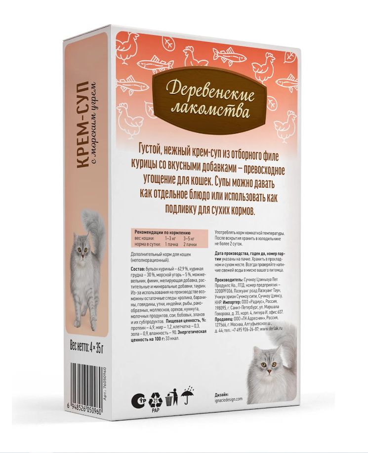 «Деревенские лакомства» Филе утки нежное, для кошек — нежнейшее филе утки в собственном соку — изысканное угощение для самых любимых. Лакомство обогащено таурином, который не только усиливает природный вкус, но и способствует поддержанию здоровья сердца и иммунной системы.