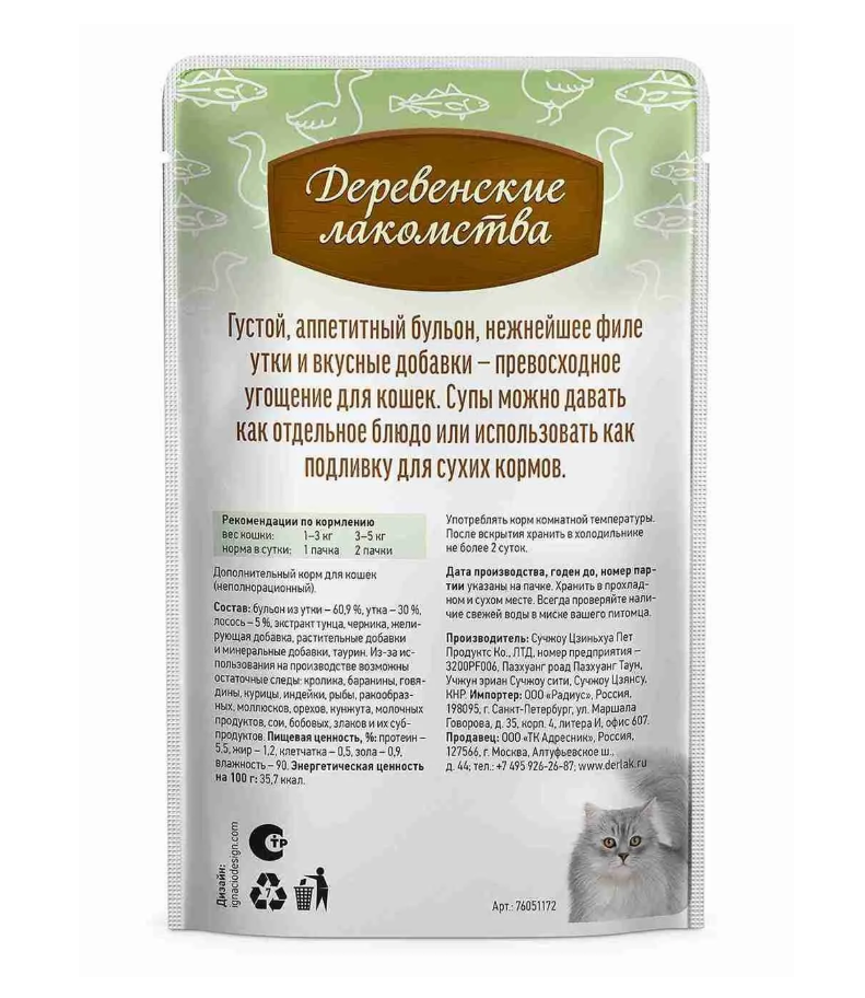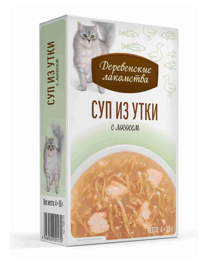 Изысканный суп с уткой и лососем: идеальный вариант для придирчивых кошек и заботливых хозяев. Только натуральные ингредиенты, тщательно отобранные для обеспечения максимальной пользы и удовольствия. Густой бульон помогает поддерживать водный баланс организма, обеспечивает необходимые питательные вещества и стимулирует аппетит. Сделайте рацион кошки разнообразным и аппетитным! Суп от «Деревенских лакомств» — это не просто еда, это выражение вашей любви и заботы о вашем пушистом друге.