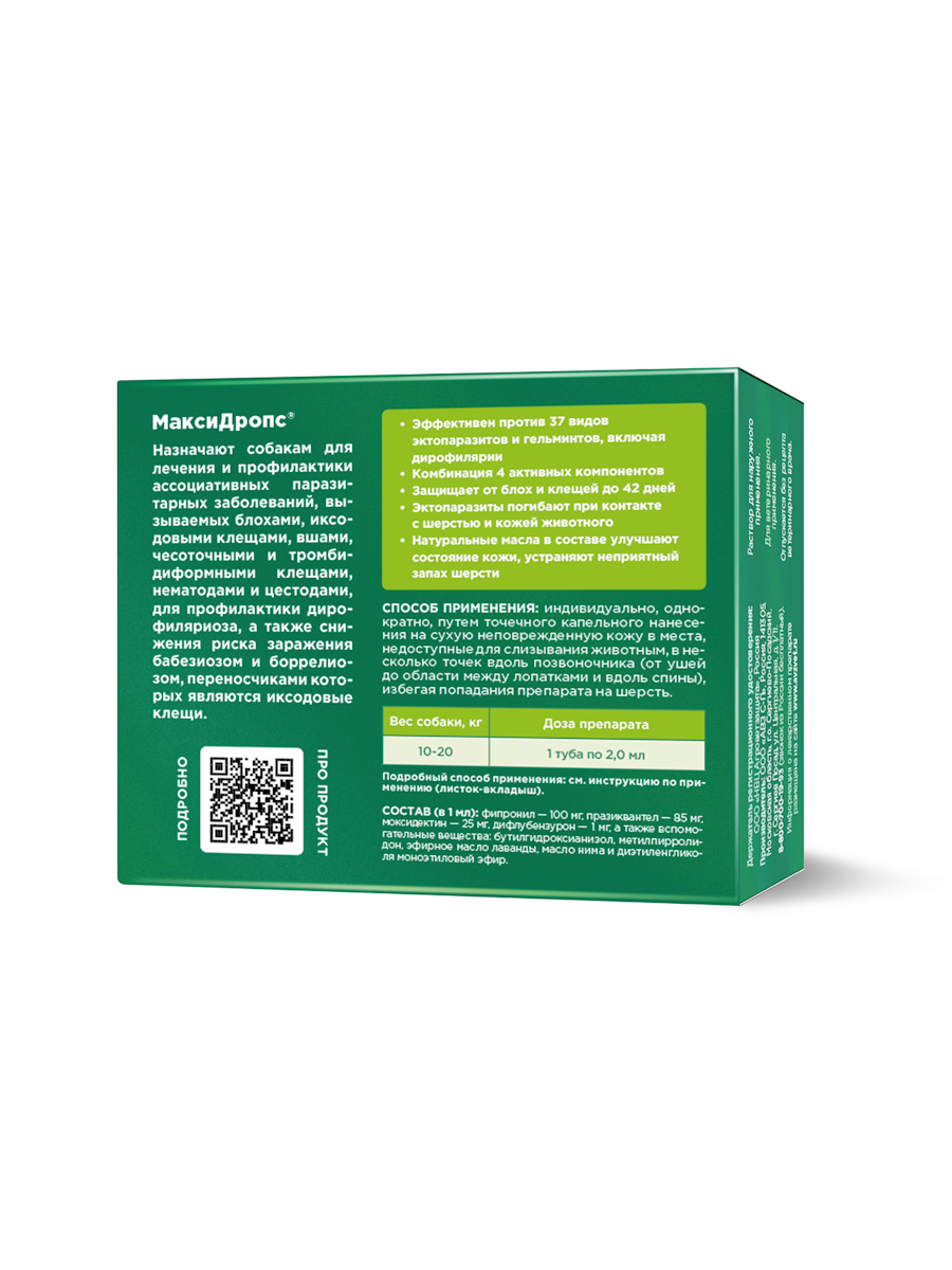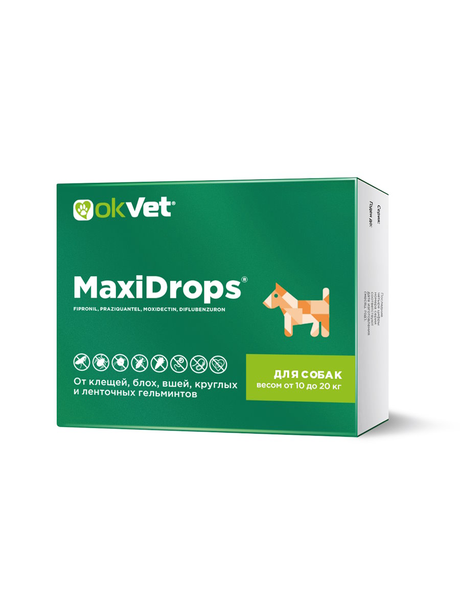 МаксиДропс® назначают взрослым собакам, кошкам, щенкам и котятам для лечения и профилактики ассоциативных паразитарных заболеваний, вызываемых блохами, иксодовыми клещами, вшами, чесоточными и тромбидиформными клещами, нематодами и цестодами, для профилактики дирофиляриоза, вызываемого личинками Dirofilaria immitis и Dirofilaria repens, а также снижения риска заражения бабезиозом и боррелиозом, переносчиками которых являются иксодовые клещи.