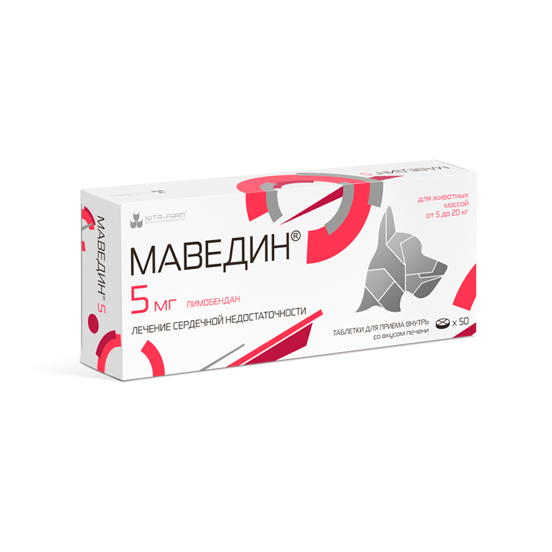 Маведин 5 содержит в 1 таблетке пимобендана 5 мг. По внешнему виду Маведин представляет собой плоские круглые таблетки от светло-розового до красного цвета, допускаются более темные или светлые вкрапления. Поверхность таблеток гладкая, с фаской, двумя разделительными бороздками на одной стороне и логотипом на другой стороне.