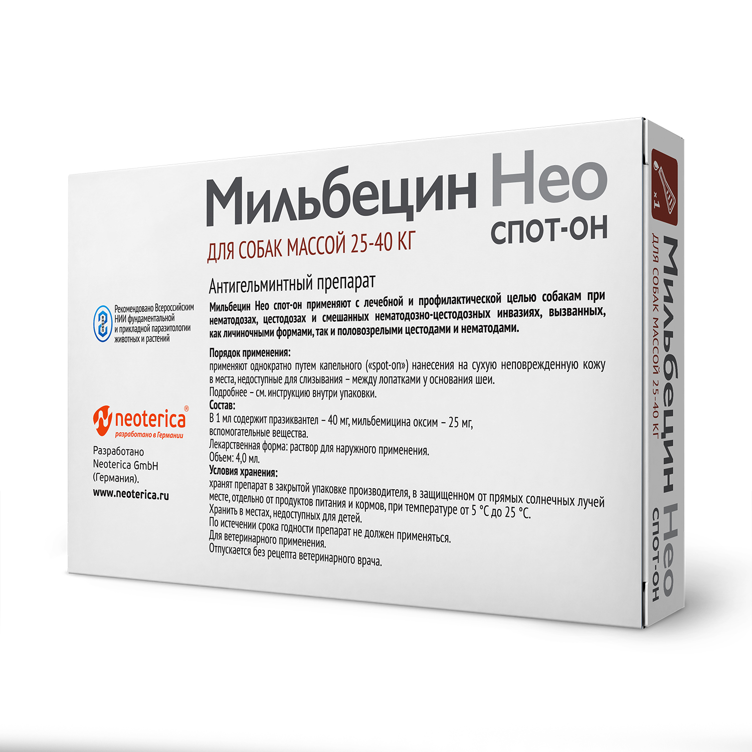 В упаковке Мильбецин Нео спот-он для собак 25-40 кг находится 1 тюбик-пипетка с 4,0 мл раствора.
