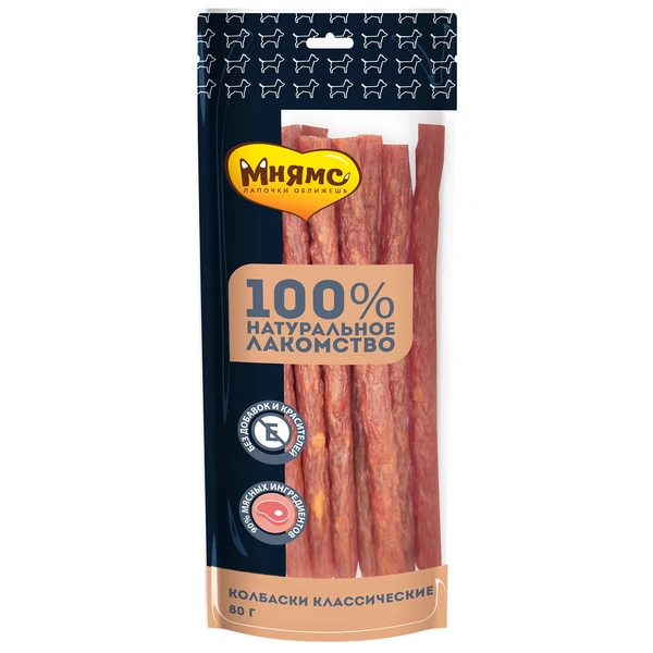 Мнямс лакомство для собак колбаски «классические» - вкусное и полезное лакомство с большим содержанием мяса для собак и щенков старше 3-х месяцев. Обладают высокой вкусовой привлекательностью, благотворно влияют на нервную и сосудистую системы, содержат розмарин- натуральный источник магния, калия, натрия, железа и фосфора. Идеально подходят в качестве ежедневного угощения и поощрения во время тренировок.