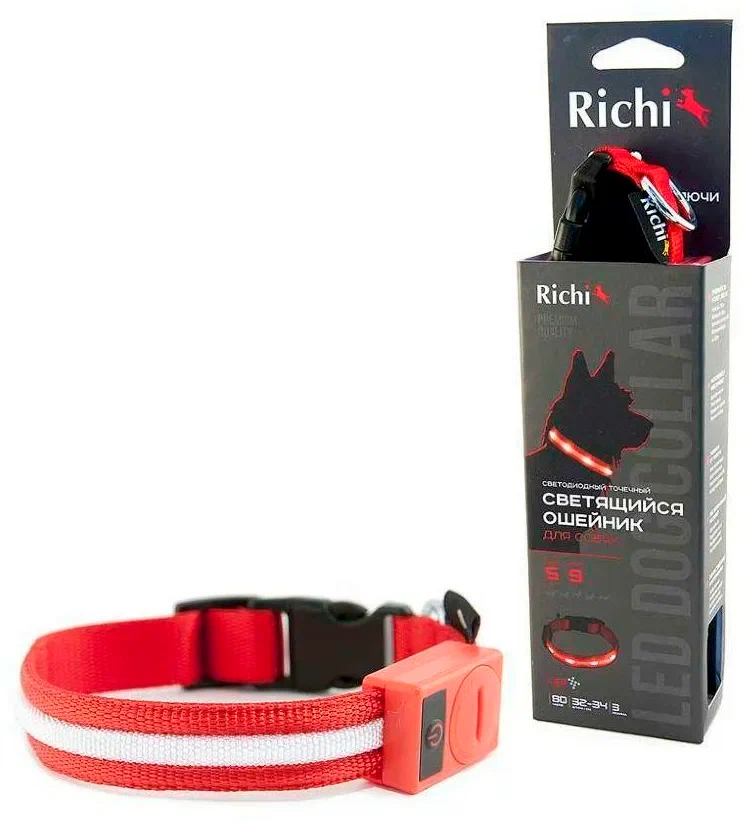Ошейник для собак Richi Светящийся, размер S, красный со светящийся лентой 3 режима 32-34 см