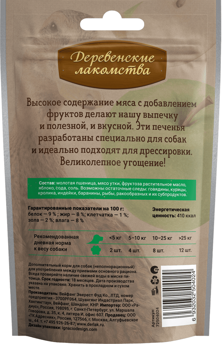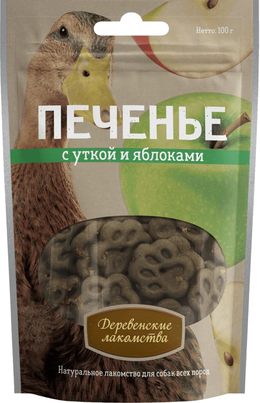 Состав: молотая пшеница, мясо утки, яблоко; натуральные пищевые добавки: фруктоза, растительное масло, сода, соль.