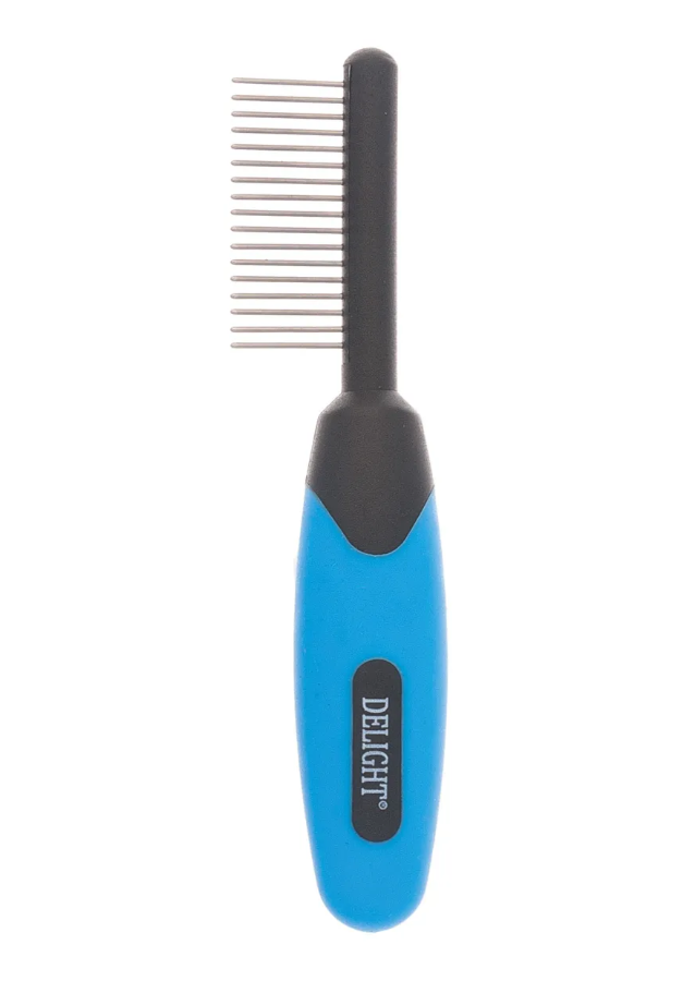 Маленькая расческа с прорезиненной ручкой. Для кошек и собак. Удаляет старую шерсть, грязь, подходит для всех видов шерсти. Перед расчесыванием сильно спутанной шерсти используйте колтунорез. Разделите шерсть на несколько участков. Расчесывание следует начинать с концов к корням шерсти. Расчески с 24-56 зубьями для ежедневного ухода. Регулярно удаляйте с расчески выпавшую шерсть. Характеристики изделия: длина 14см, 17 зубьев, высота зуба 17мм, вес 40г.