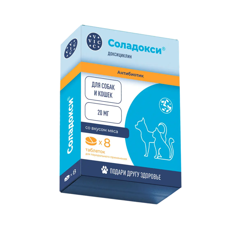 Соладокси назначают кошкам и собакам при болезнях органов дыхания (ринит, тонзиллит, бронхопневмония), мочеполовой системы (цистит, пиелонефрит, простатит, эндометрит), кожи (гнойные дерматиты, абсцессы) и других инфекциях, возбудители которых чувствительны к доксициклину.