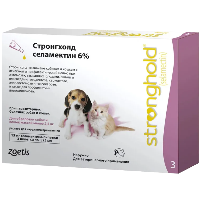 Противопоказания: Повышенная индивидуальная чувствительность к препарату. Запрещается применять Стронгхолд щенкам и котятам моложе 6-недельного возраста, больным инфекционными болезнями и выздоравливающим животным. Не следует использовать препарат внутрь или инъекционно. При терапии отодектоза не вводить Стронгхолд непосредственно в ушной канал. Не рекомендуется наносить препарат на влажную кожу животного. После нанесения препарата не допускать контакта обработанного животного с источником огня и высокой температуры до полного высыхания шерсти животного.