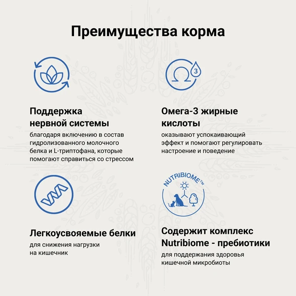 Показания к применению: стрессовые ситуации (например, при которых возникает беспокойство или страх) наряду с изменением поведения; сепарационная тревога. Основные преимущества рациона: