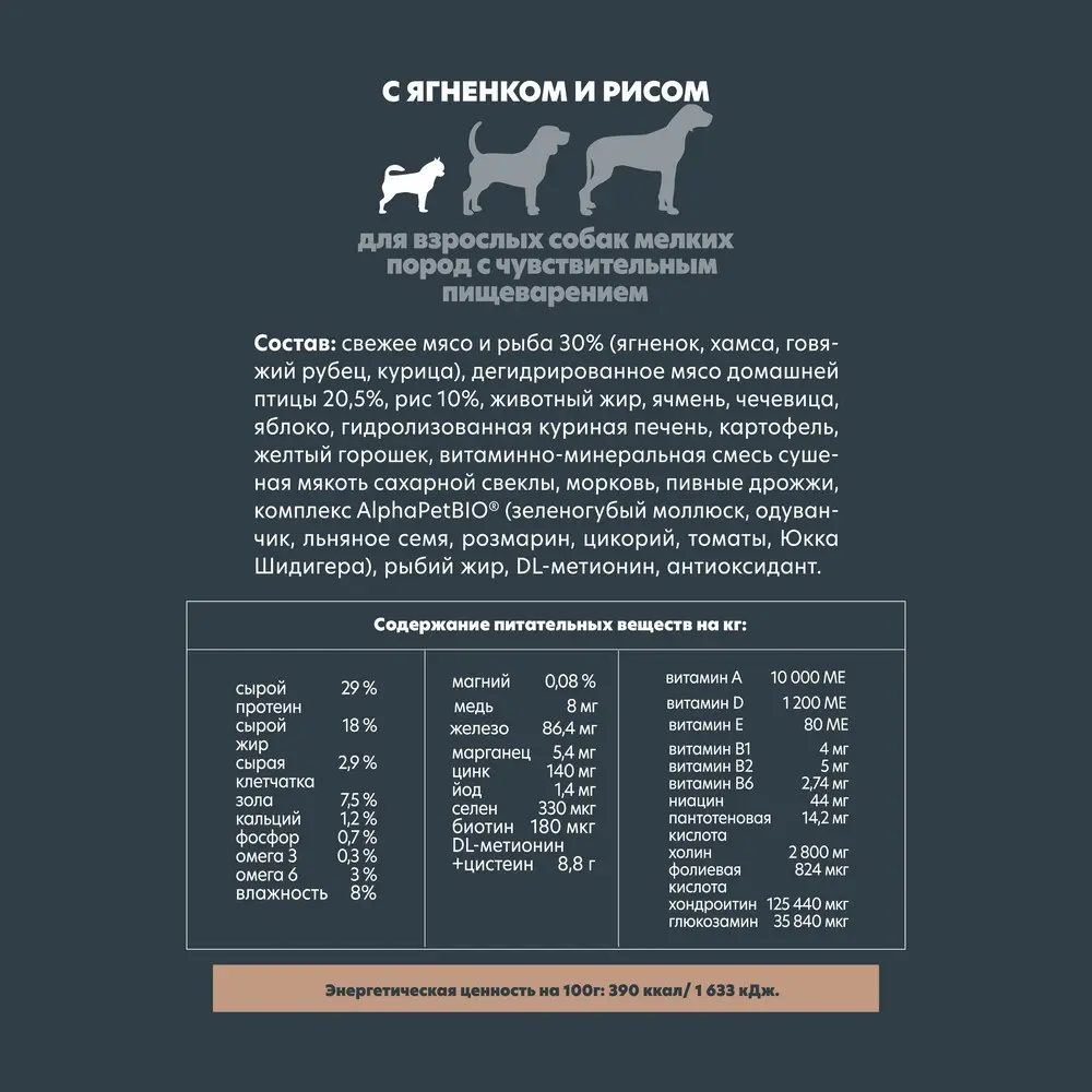 Полнорационный сухой корм с натуральным мясом ягнёнка и добавлением риса. Разработан под брендом AlphaPet Superpremium для взрослых собак мелких пород с чувствительным пищеварением. Сухой корм для собак содержит в составе 80% мясного белка. Специальная технология обработки компонентов позволила сохранить вкусовые и питательные свойства натурального свежего мяса. Корм для собак мелких пород весом не больше 10 кг.