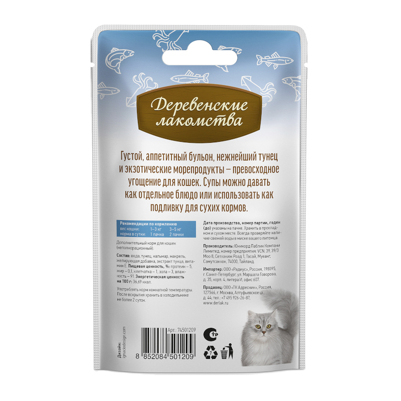 Густой аппетитный бульон с нежнейшим тунцом, кальмаром и макрелью — превосходное угощение для кошек. Лакомство можно давать как отдельное блюдо или использовать как подливку для сухих кормов.