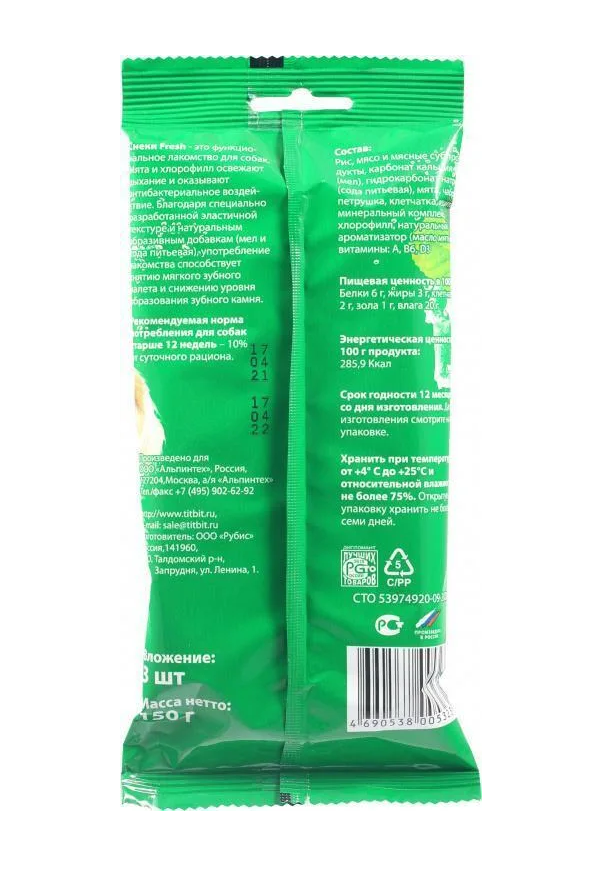 FRESH SNACK это функциональное лакомство для собак. Мята и хлорофилл освежают дыхание и оказывают антибактериальное воздействие. Благодаря специально разработанной эластичной текстуре и натуральным абразивным добавкам (мел и сода питьевая), употребление лакомства способствует снятию мягкого зубного налета и снижению уровня образования зубного камня.