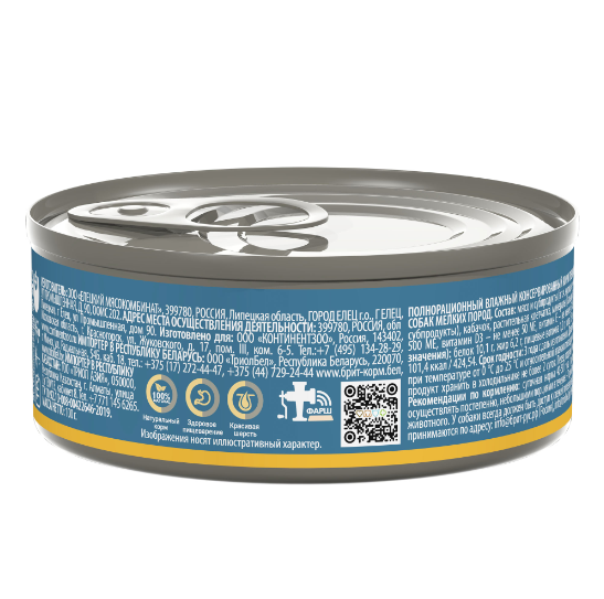 Консервы идеально подходят для собак мелких пород, обеспечивая оптимальную разовую порцию. Срок годности составляет 3 года с даты производства, указанной на упаковке. Храните корм при температуре от 0 °С до 25 °С и относительной влажности воздуха не более 75 %. После вскрытия упаковки храните продукт в холодильнике не более 2 суток и перед подачей доведите до комнатной температуры.